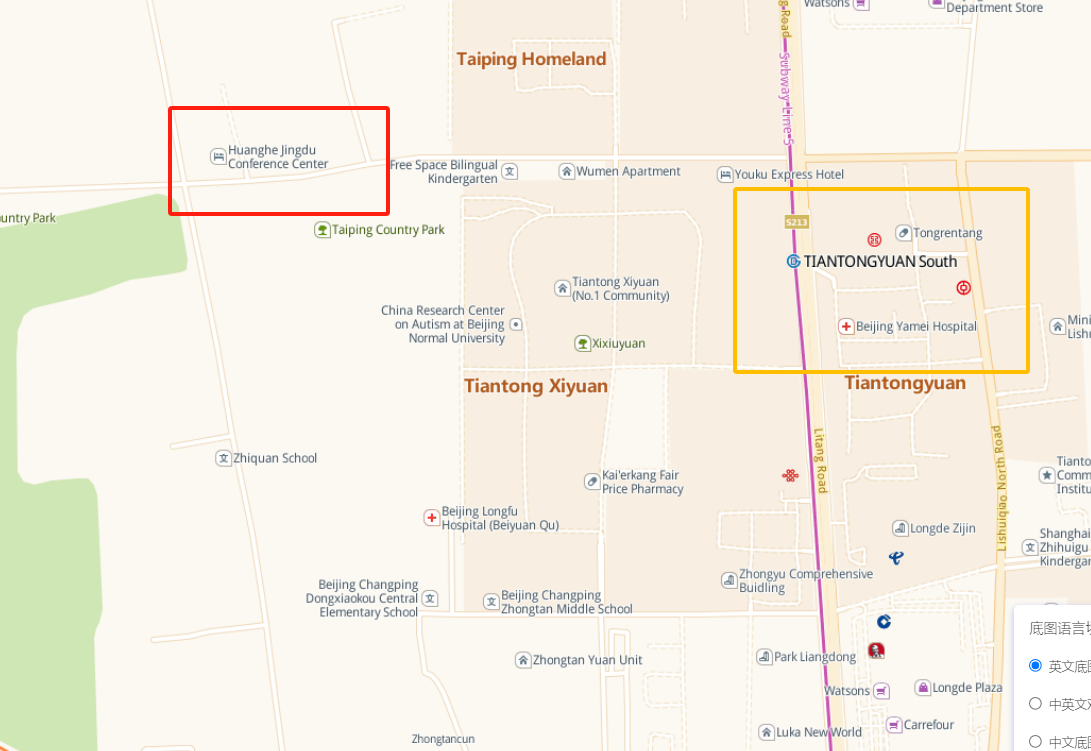 Showing in the map following, The red square is the conference venue. The yellow line square is the metro line 5 Tiantongyuan South station,