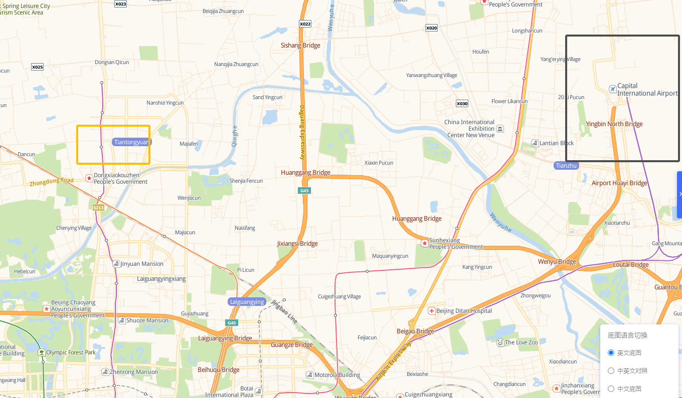 The nearest international airport is 北京首都国际机场Beijing Capital International Airport as showing in the following: The gray square is the Beijing Capital International Airport, The yellow line square is the metro line 5 Tiantongyuan South station,